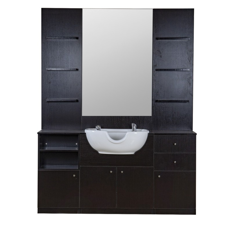 Bancada de Barbeiro elegante com várias gavetas e prateleiras para poder guardar e ao mesmo tempo expor produtos.