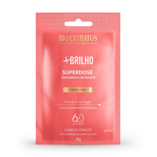 Após lavar os cabelos com shampoo, aplique a Superdose +Brilho por toda a extensão dos fios, massageando suavemente. Deixe agir por 60 segundos. Enxágue. Use também os outros produtos da linha +Brilho.