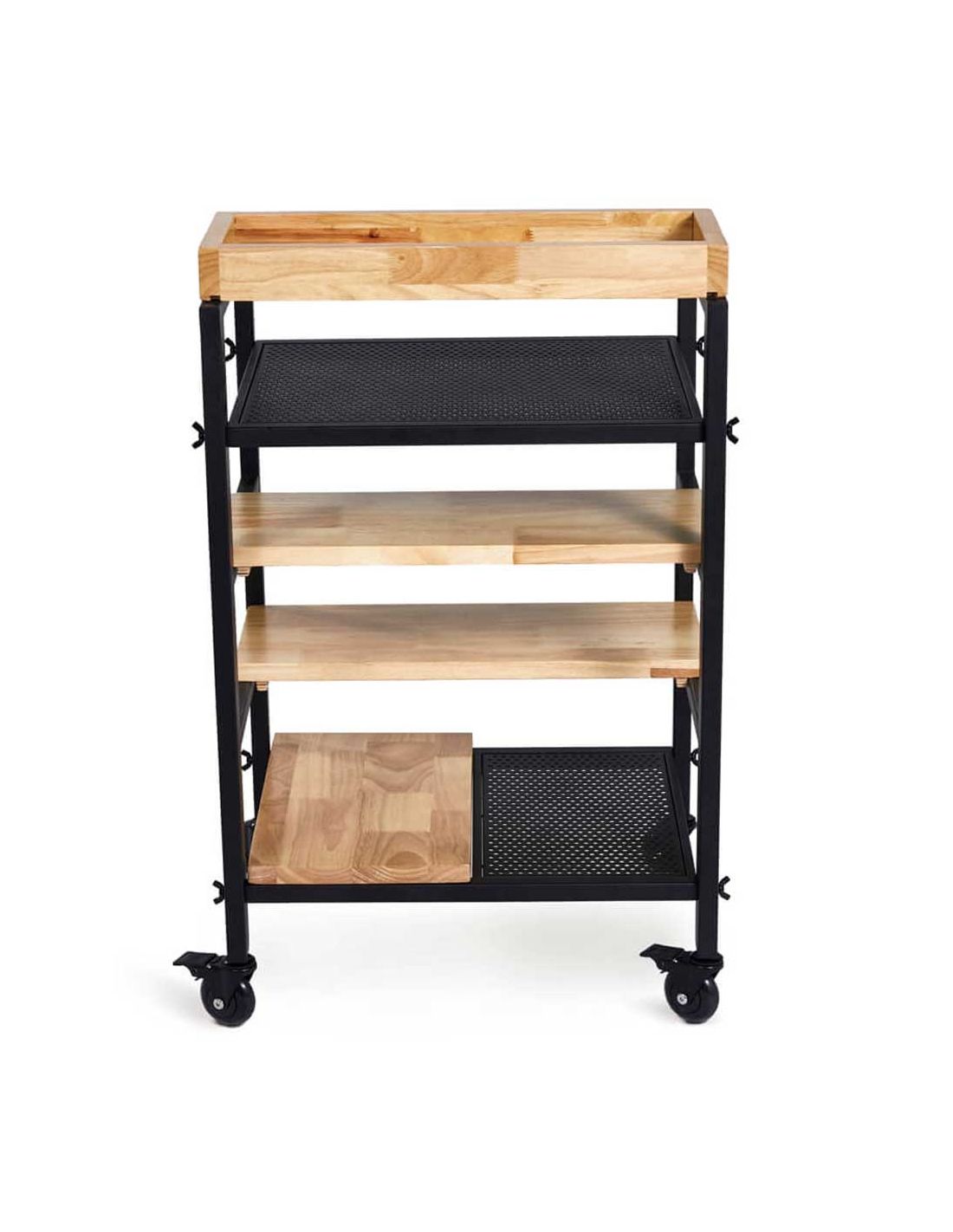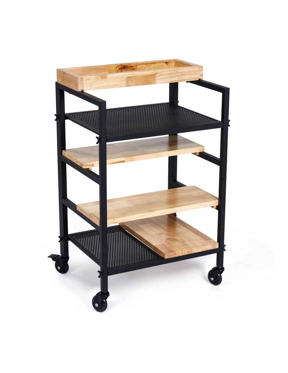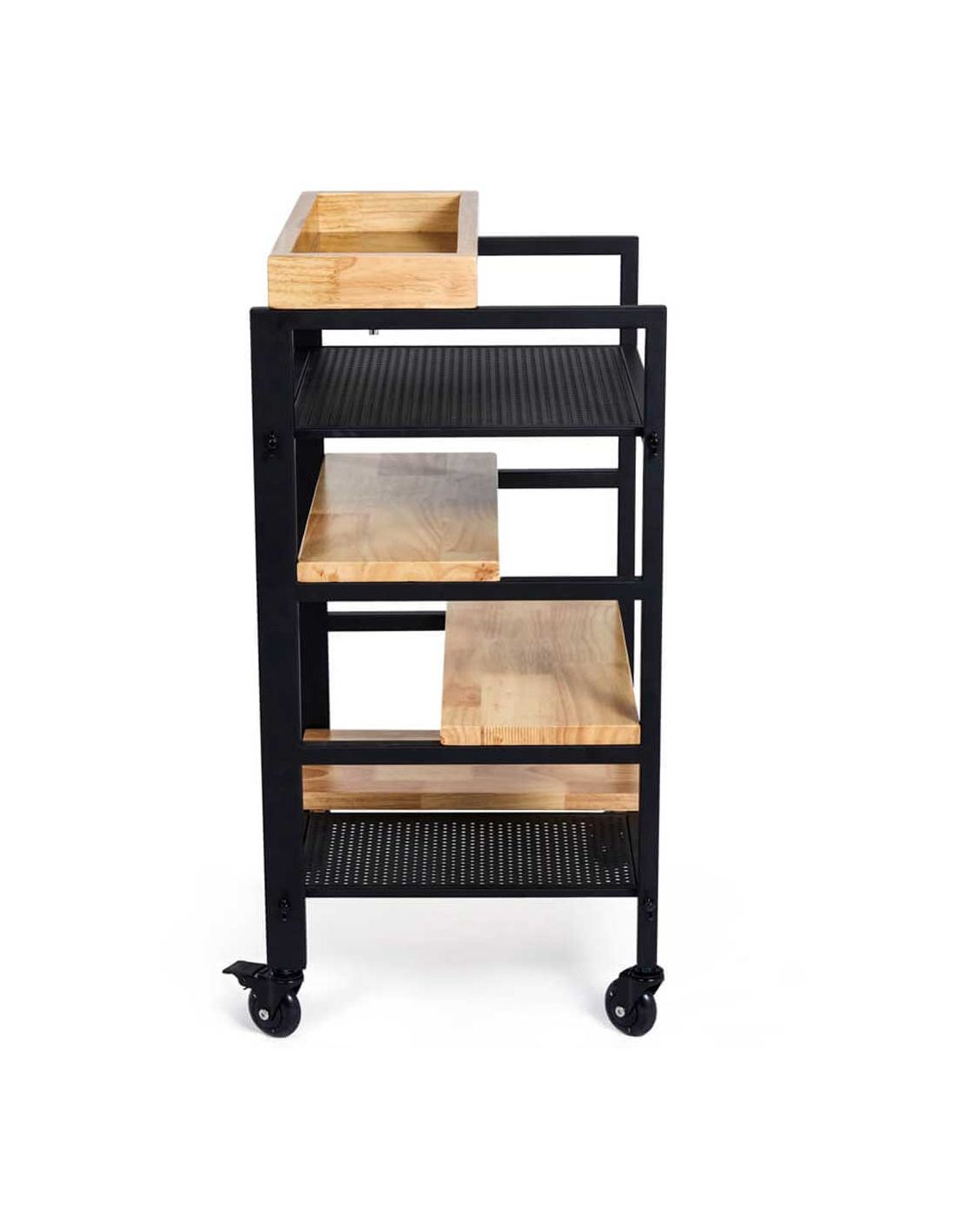 Carrinho Auxiliar SKYE , moderno, elegante e de design industrial. Funcional e prático graças às suas prateleiras que servirão de apoio ao seu material de trabalho. Fabricado em madeira tratada e envernizada, com estrutura de metal pintada de preto.