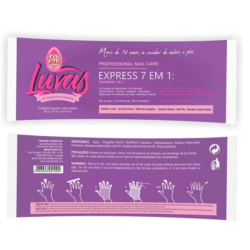 Modo de usar: Retirar o verniz. Lime as unhas. Coloque as luvas e aguarde alguns minutos, após espalhar o emoliente. Rompa as pontas dos dedos das luvas e inicie o retirar cutículas. Retire as luvas, massage as mãos com emoliente. Aplique acetona nas unhas para ativar a fixação do verniz. Finalizar com as aplicações de base e verniz.