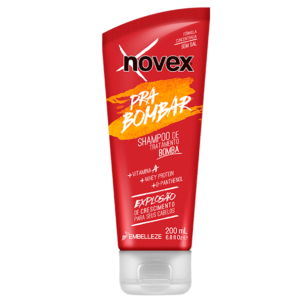 O Champô Novex Pra Bombar oferece Vitamina A para os cabelos crescerem mais rápido; Whey Protein para aumentar a força do fio; e ainda D-Pantenol, que oferece uma explosão de brilho, suavidade e protege das pontas espigadas.