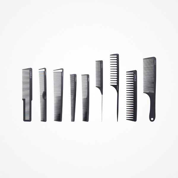 Conjunto multiuso de nove pentes profissionais em um estojo prático. Feito com carbono leve e revestimento iônico antiestático que realça o brilho. Resistente ao calor e a produtos químicos.
