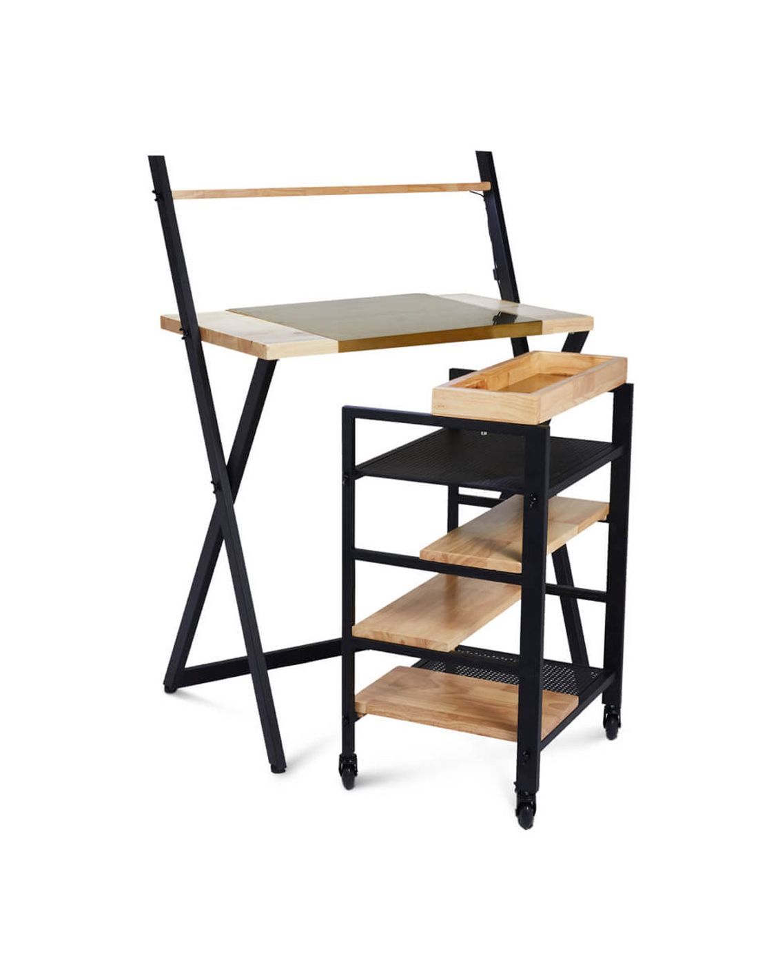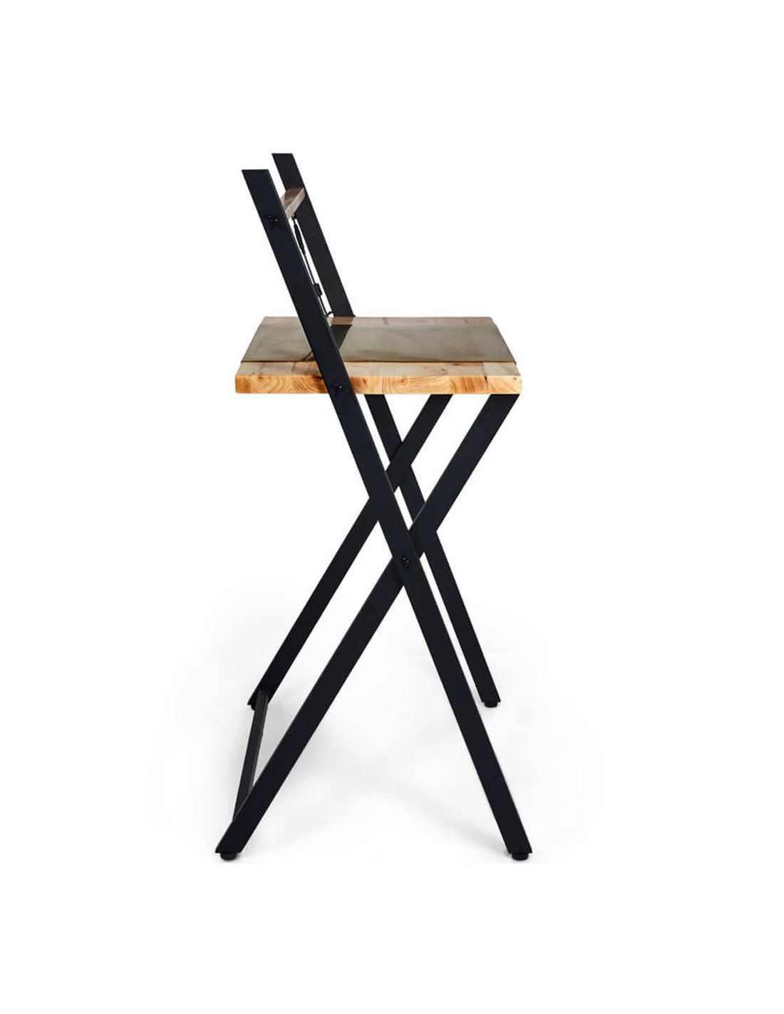 Mesa de Apoio IRIS , moderna, elegante e de design industrial. Funcional e prática graças à sua prateleira com base translúcida de luz LED de forma a iluminar os seus produtos ou material de trabalho. Fabricada em madeira tratada e envernizada, com estrutura de metal pintada de preto.