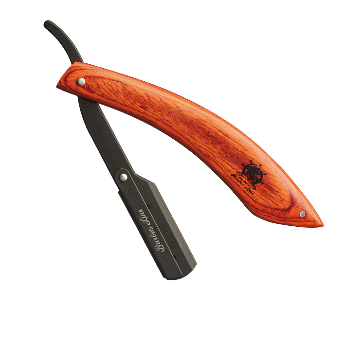 Navalha Barber Line Aço inoxidável 430, revestimento preto, madeira americana em laranja. Inclui estojo de pele sintética . Meia folha.