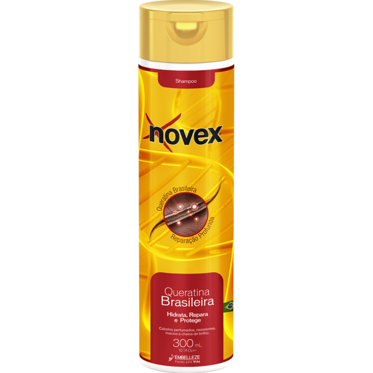 O Champô Novex Queratina Brasileira hidrata, repara e protege os cabelos ressequidos e danificados pelos processos químicos.