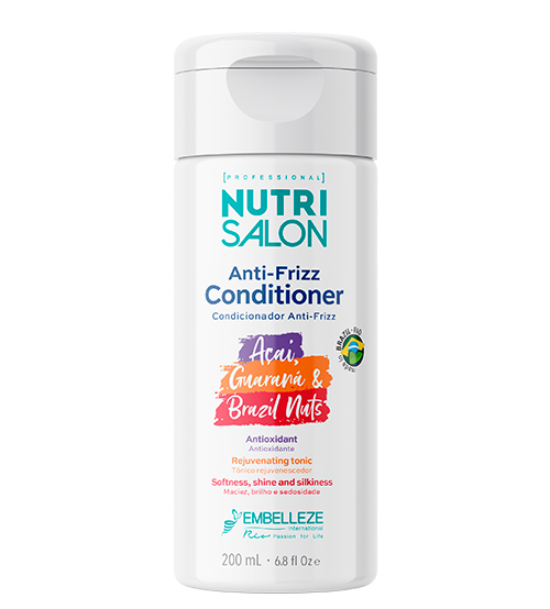 Nutrisalon Anti-frizz é a certeza de um cabelo liso incrível: são apenas três passos para um alisamento capilar eficaz e perfeito! Esta família possui ingredientes naturais do Brasil: Açaí, Guaraná e Brasil Nuts, conhecidos como os segredos da Amazónia, através dos quais é possível ter um liso perfeito e saudável, com brilho incrível a cada aplicação. O condicionador auxilia na manutenção do alisamento e serve para manter o cabelo liso por muito mais tempo.