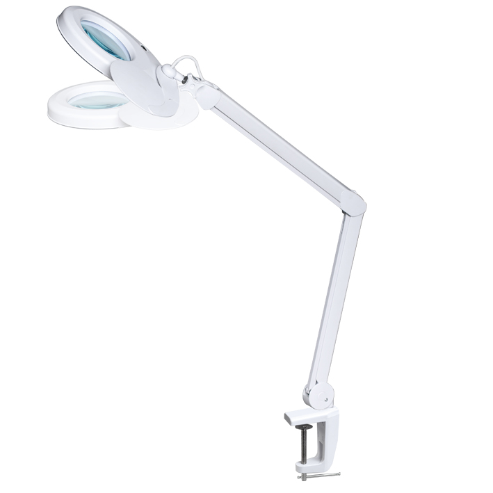 Tamanho da lente: 127 mm. Tampa protetora para lente. Braço articulado para suporte de lupa. Braçadeira de mesa incluída. 8 dioptrias. 40cm x 40cm.