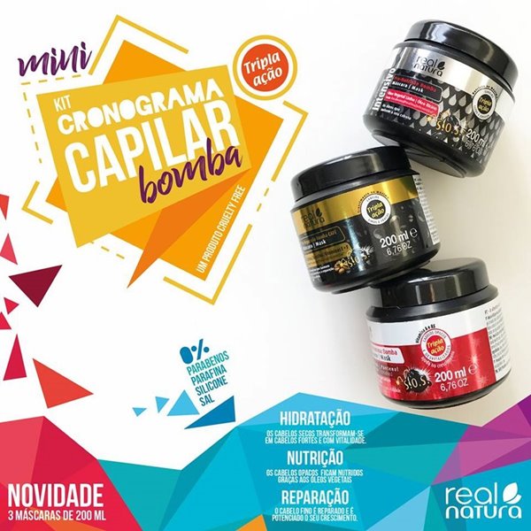 Mini Kit Cronograma capilar Bomba Real Natura contém 3 máscaras para nutrir, reparar e hidratar o cabelo.