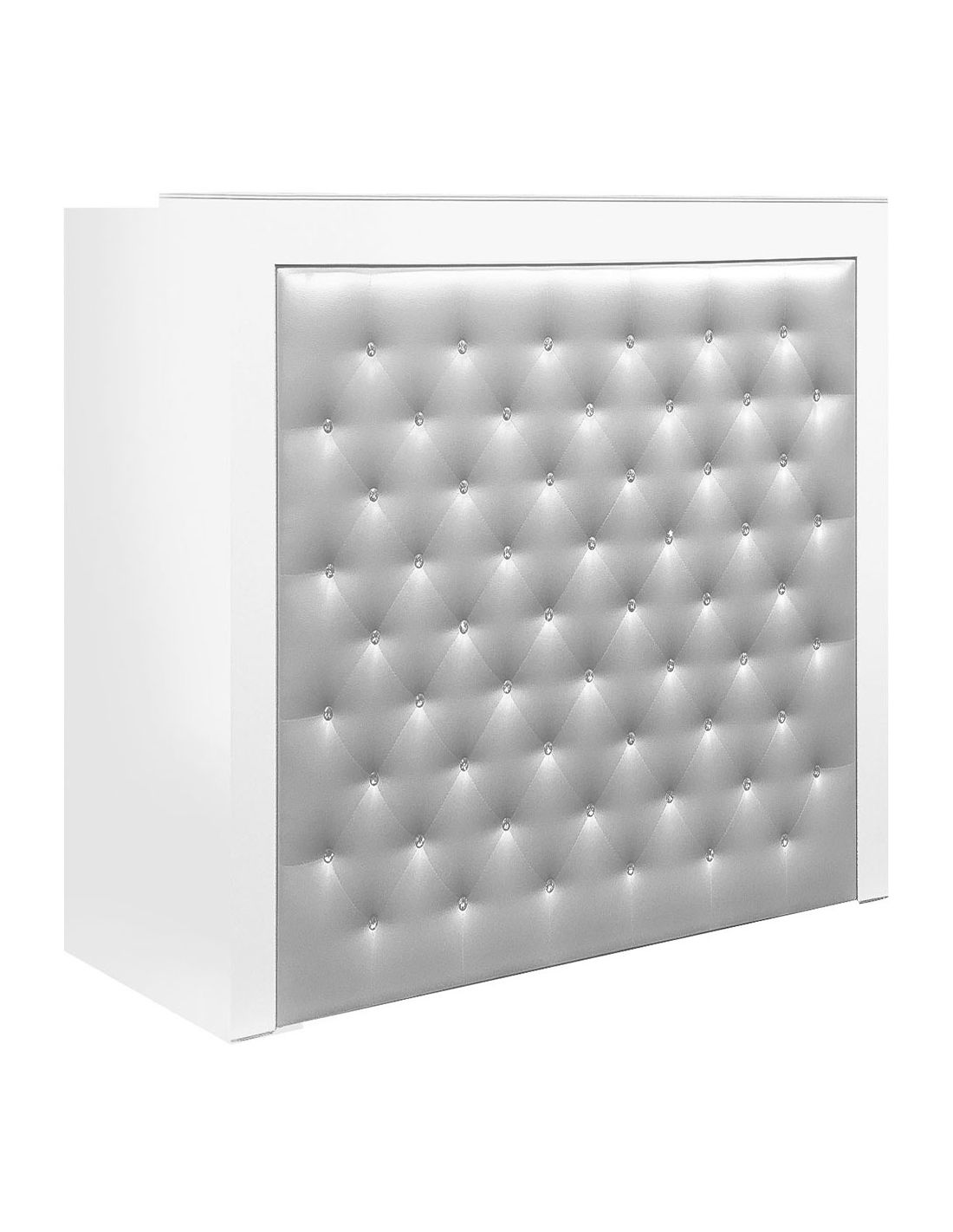 Balcão de recepção Diamond com aro frontal lacado a branco e painel frontal forrado com botões diamante.