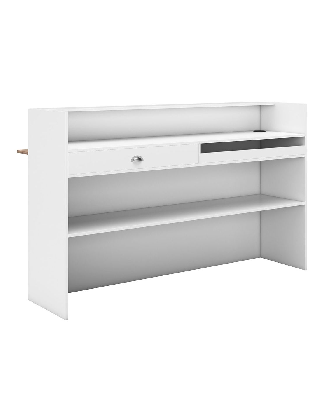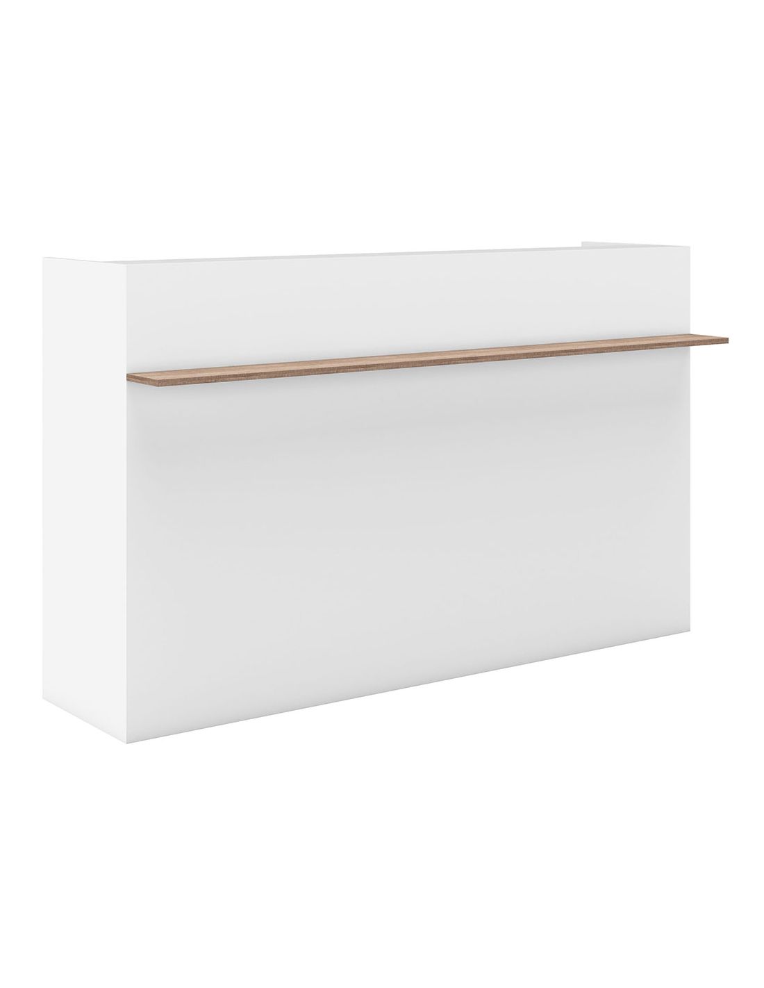 Balcão de receção Elegance em laminado branco standard com prateleira frontal.