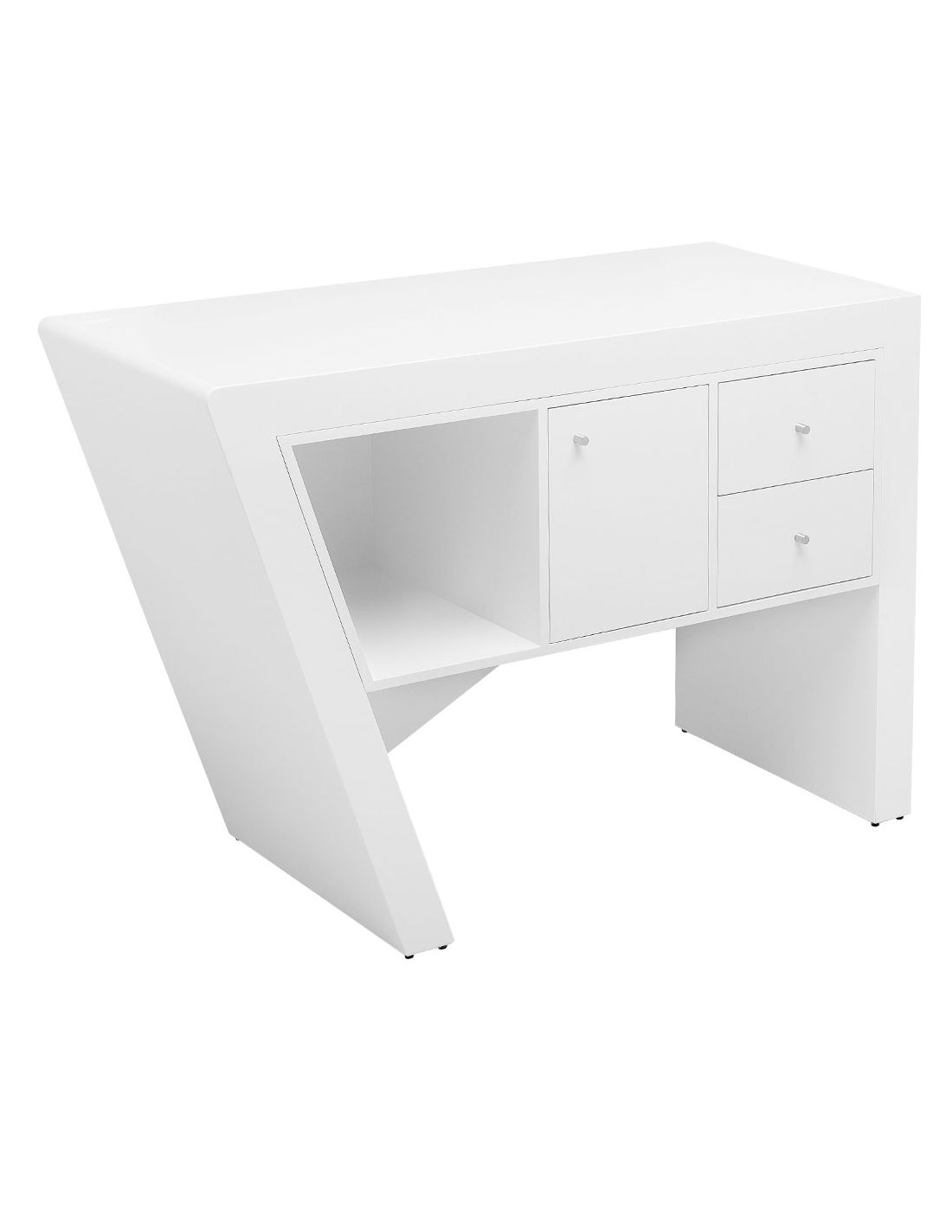 Balcão de recepção Glam lacado a branco com painel forrado.