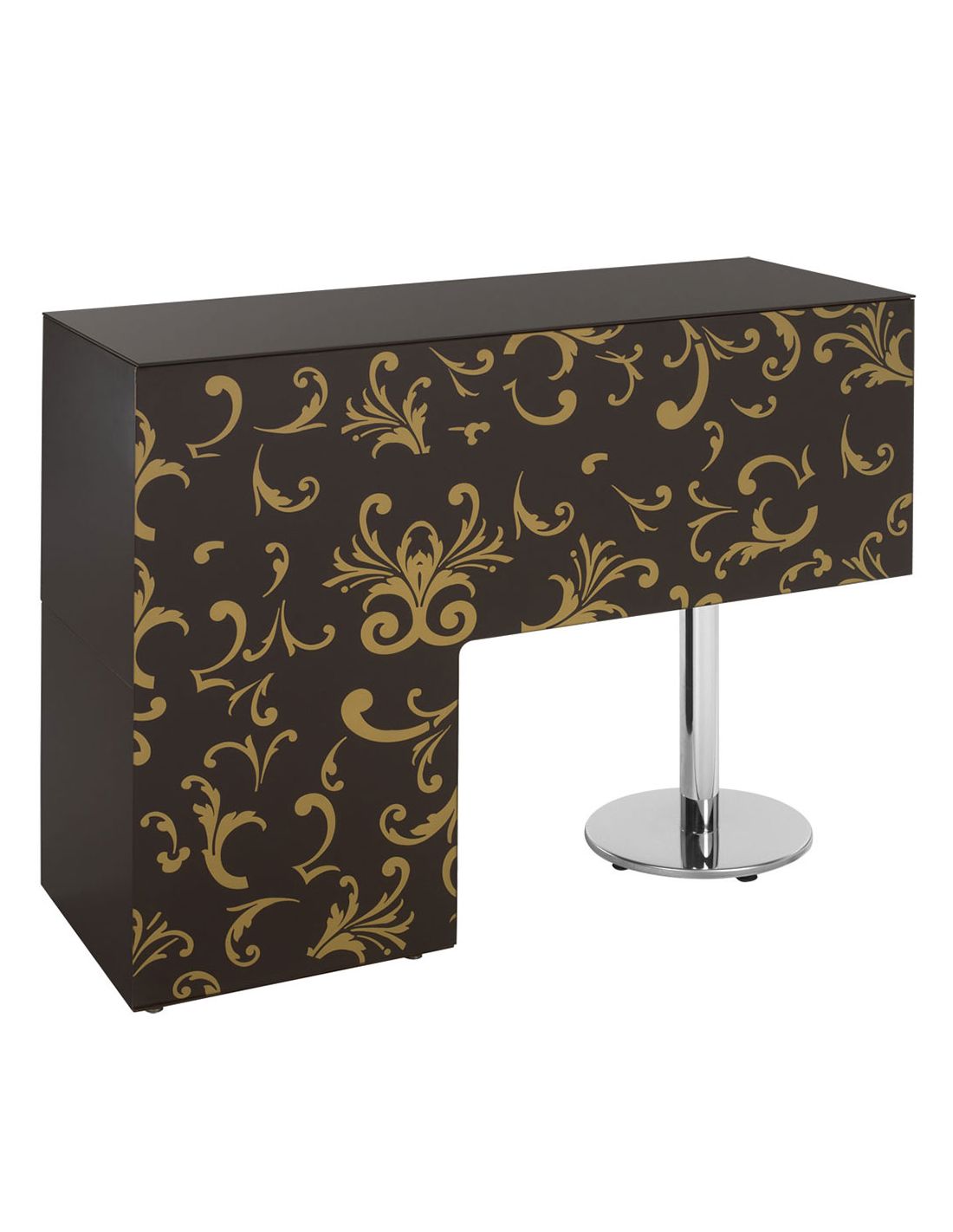 Balcão de recepção lacado a castanho com tampo em vidro pintado de castanho. Frente em vidro com decoração em castanho e dourado. Pé com base redonda em inox.