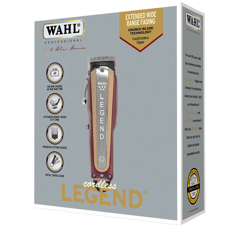 As lâminas da Legend Cordless usa a tecnologia "Crunch Blade" da Wahl, combinada com a famosa lâmina de cunha da Legend, para oferecer ângulos de corte exclusivos para um corte mais brusco e um corte uniforme e misturado. O ângulo mais raso das lâminas e as ranhuras de corte mais longas proporcionam maior precisão, enquanto o alcance cônico especialmente projetado da Cordless Legend oferece um desvanecimento de amplo alcance mais curto, mais preciso e estendido.
