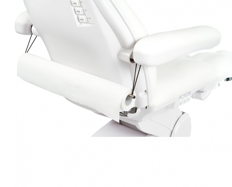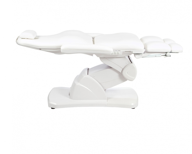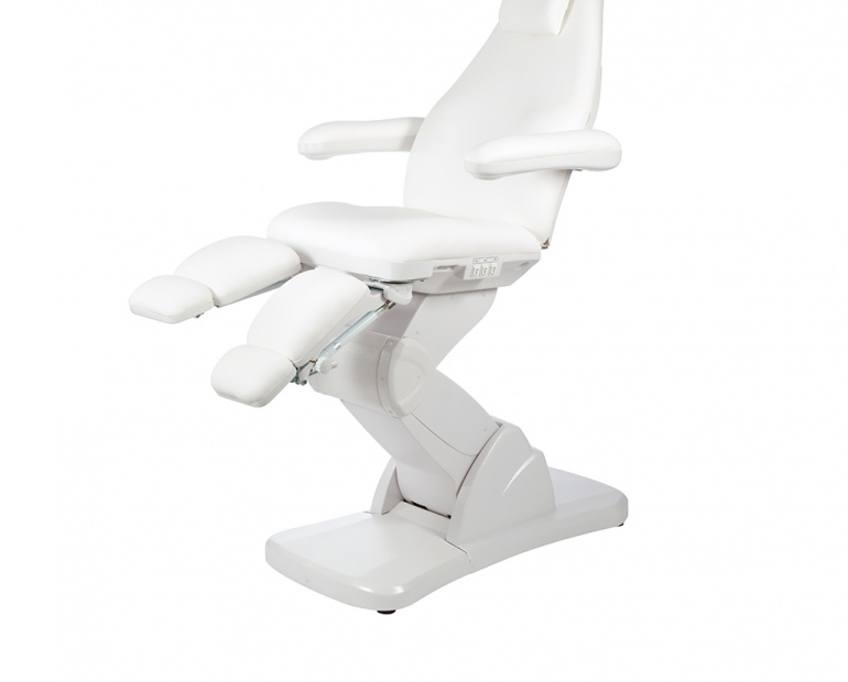 Cadeira de Podologia equipada com 3 motores que controlam a altura, o encosto e a inclinação do assento. Apoios de braço reclináveis e almofada de apoio de cabeça removível com orifício de respiro. Apoios de perna giram até 90° e são ajustáveis em altura por elevação de gás. Os painéis de botões embutidos no encosto, no apoio de pernas e no assento permitem um controle completo de todas as funções de qualquer ponto da cadeira. Estofo em PVC branco sem costura de alta qualidade que facilita a limpeza.