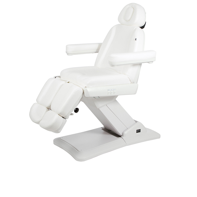 Cadeira de Podologia com uma estrutura muito estável. Equipada com 3 motores que controlam altura, encosto e inclinação do assento. Apoios de braços ajustáveis em altura por elevação de gás. Apoios de braço reclináveis e apoio de cabeça ajustável com orifício de respiro. Os painéis de botões embutidos no encosto e no assento permitem um controle completo de todas as funções de qualquer ponto da cadeira. Esta versão inclui a função RESET para trazer a cadeira de volta à posição zero. Estofo em PVC branco de alta qualidade que facilita a limpeza.
