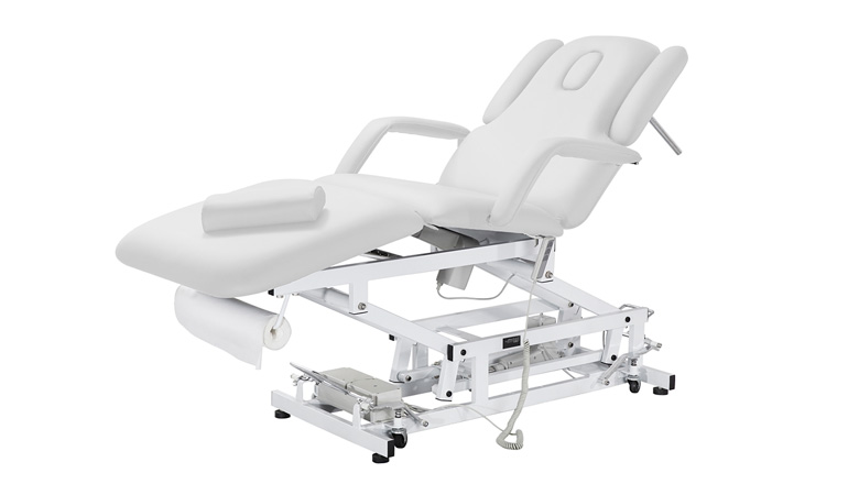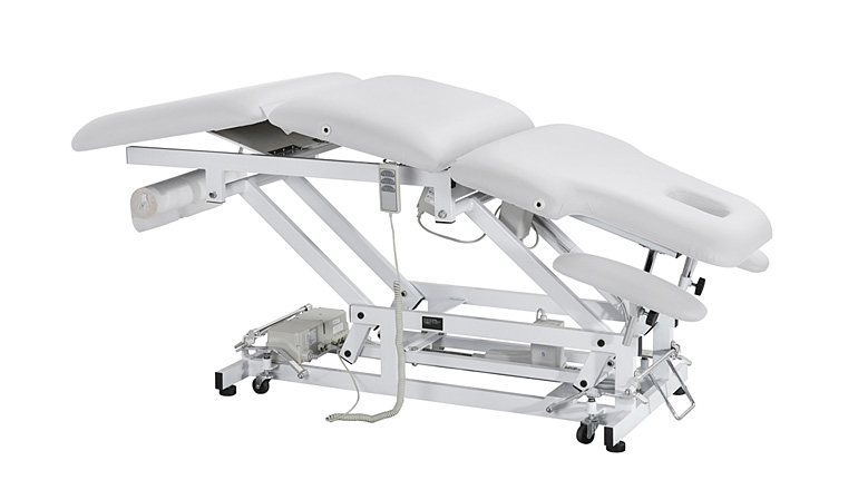 Marquesa de alto desempenho particularmente adequado para a fisioterapia. É composto por 3 motores que regulam a altura, ângulo do encosto e do módulo central. Apoios de braços ajustáveis, encosto de cabeça com Orificio facial e almofada adicional. Estrutura metálica com rodas retráteis para fácil circulação. Estofo branco de alta qualidade e fácil de limpar. Porta Rolos incorporado.