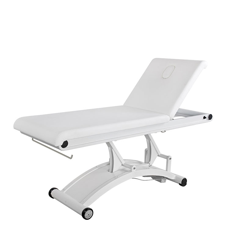 Marquesa de 2 seções com design minimalista. Equipada com 1 motor que controla a altura da mesa. Encosto ajustável por elevação a gás. Base metálica curva robusta com 2 rodas para facilitar a sua mobilidade. Estofo em PU branco de alta qualidade que facilita a limpeza.