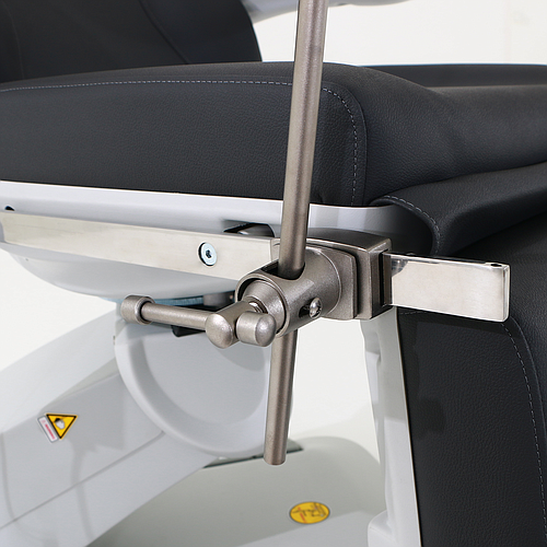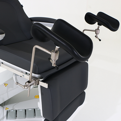 Cadeira de ginecologia de luxo com estrutura muito estável, especialmente projetada para otimizar o espaço de trabalho graças à sua rotação de 120°. 4 motores controlam a altura, encosto, assento e inclinação do apoio para os pés. Fornecido de série com apoios de braços reclináveis e suportes de pernas ajustáveis. O controlador de pé embutido permite um controle completo de todas as funções de qualquer ponto da cadeira. Esta versão inclui sistema de trava de segurança e função RESET para trazer a cadeira de volta à posição zero. Estofamento PU cinza de alta qualidade que facilita a limpeza. Suporte de rolo e proteção plástica para apoio para as pernas incluídos. Este produto é projetado de acordo com o regulamento de dispositivos médicos 2017/745.