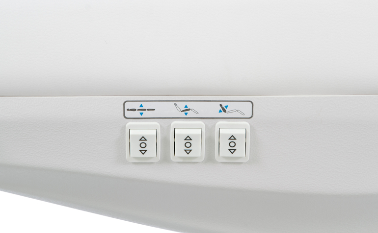 Marquesa de estética eléctrica 3 seções com 3 motores que controlam altura, encosto e inclinação do assento. Assento para pés ajustável por elevação a gás. Apoios de braço reclináveis e apoio de cabeça ajustável com orifício de respiro. Os painéis de botões embutidos no encosto e no assento permitem um controle completo de todas as funções de qualquer ponto da cadeira. Estofo em PVC branco de alta qualidade que facilita a limpeza.