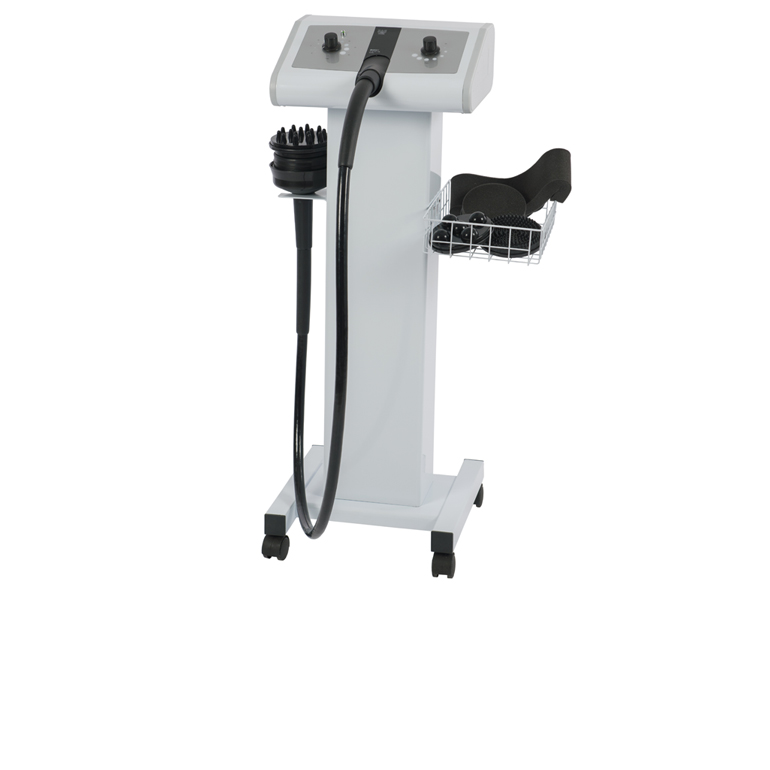 Equipamento de massagem corporal vibratório equipado com 5 cabeças para diferentes tratamentos. Tempo e intensidade ajustáveis.