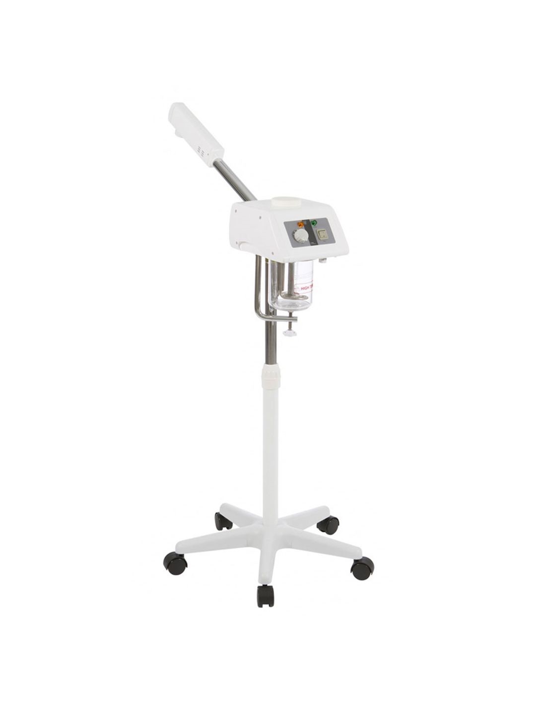 Vaporizador de Ozono com design funcional e simples. Equipado com um braço giratório e uma cabeça giratória com recipiente para óleo aromático. Inclui um recipiente para ervas no depósito de água. Regulável em altura e base estável com rodas para fácil movimentação.